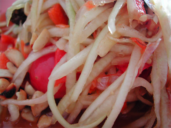 | 25 Som Tam | The traditional spicy salad ofnorthern Thailand. Shreddedvegetables, tomatoes, garlicand chillies are pounded in astone mortar together with Thai preserves and spices. This delicious salad needs sticky rice. | 6.50 |